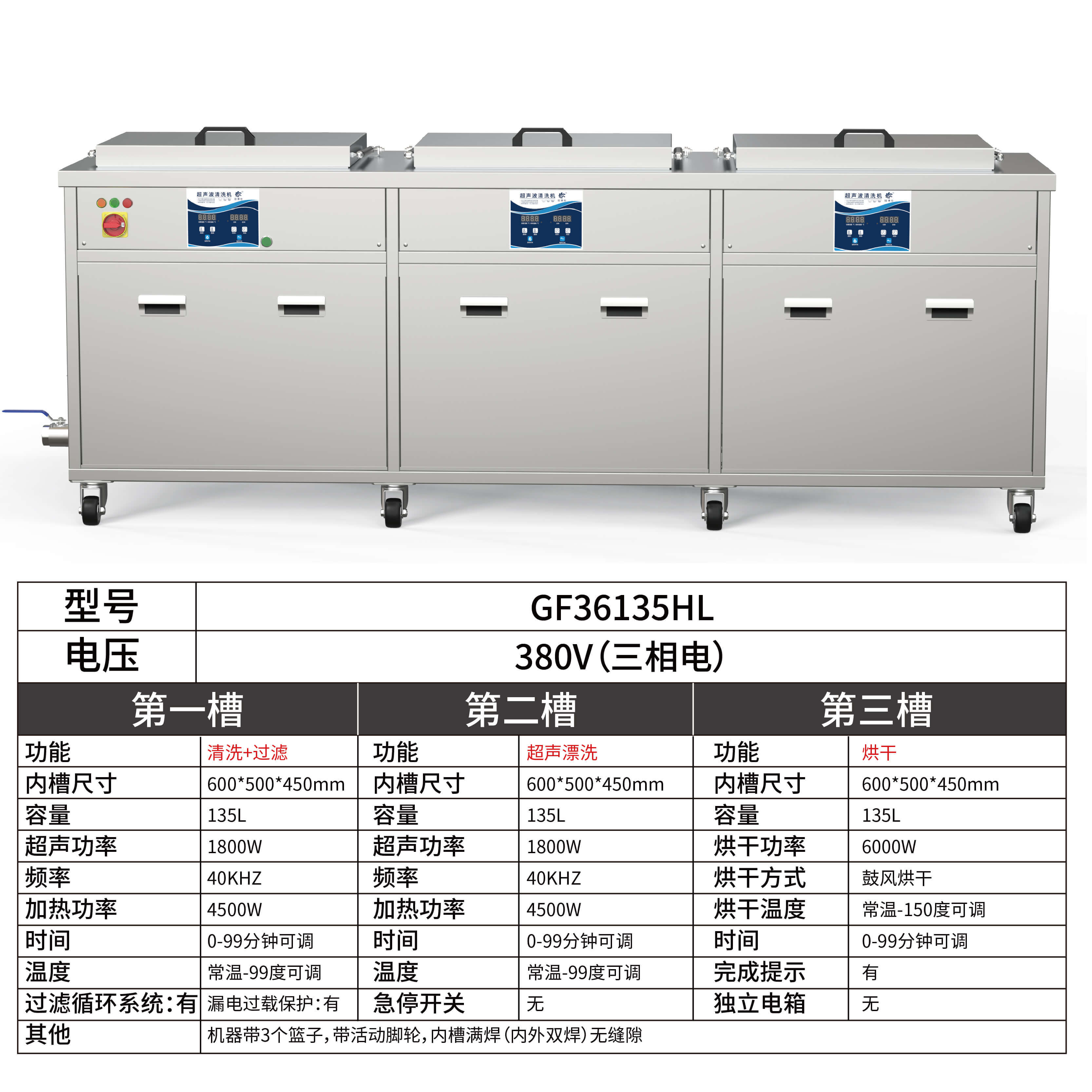 冠博仕GF36135HL三槽超聲波清洗機 | 135L/1800W | 工業級過濾漂洗烘干設備 五金模具汽修零件強力除油除銹