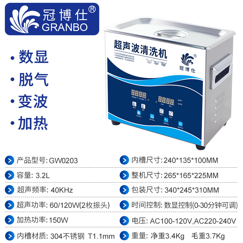 冠博仕GW0203超聲波清洗機(jī)|2L/120W|變波脫氣帶加熱